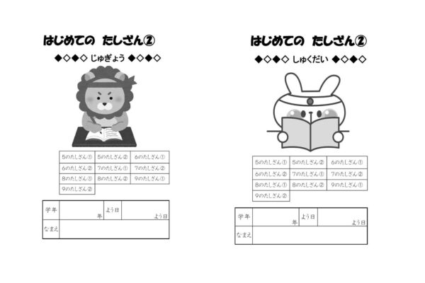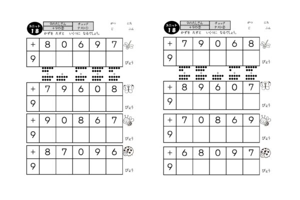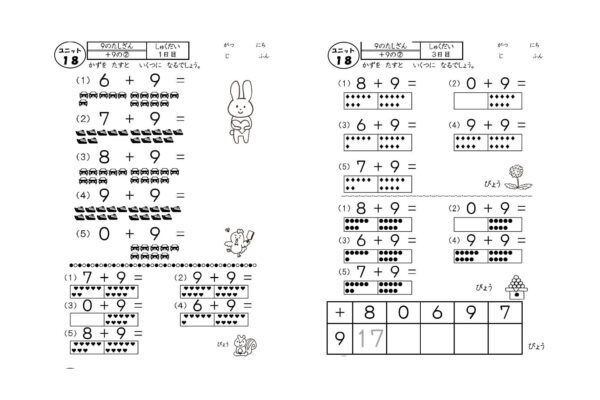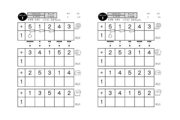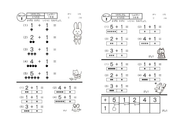 +1~5と+6~9の2冊セット。 はじめてのかずの次のステップ教材で、各数字2回ずつ練習できます。 授業用:1ユニット問題4種類 授業用:1ユニット問題3種類×2