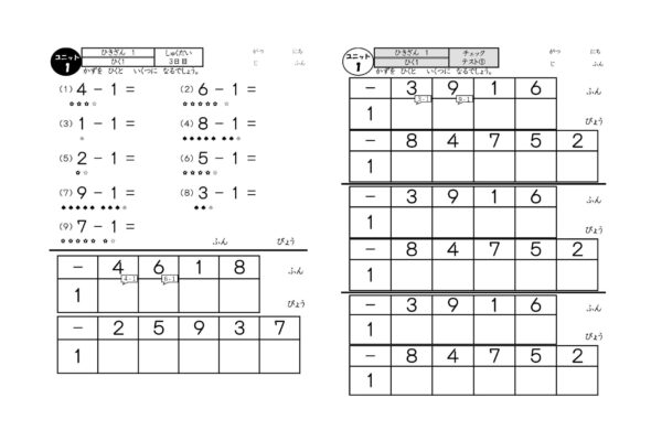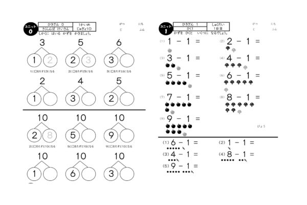 はじめてのかず→はじめてのたしざんの次のステップ教材になります。 授業用:1ユニット問題3種類 宿題用:1ユニット問題3種類×2 ※2冊同じものを購入された場合、はじめてのたしざんと同価格となります