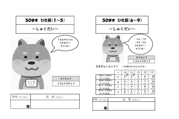 -1~5と-6~9各4週分の2冊セット。 十ます計算の次のステップ教材になります。