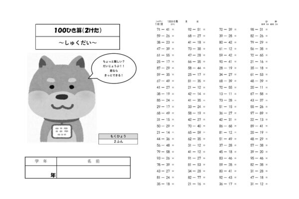 百2桁ひき算4週分。 百ます・百割計算の次のステップ教材です。