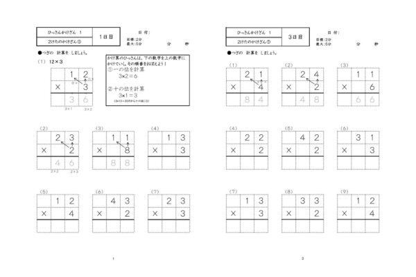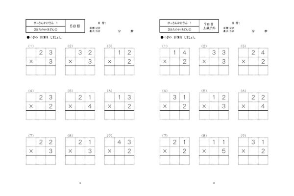 筆算かけ算を8週で完結!スコーラで使用していた宿題用と授業用冊子を上下巻にまとめました! 2桁・3桁のかけ算を反復練習していきます。