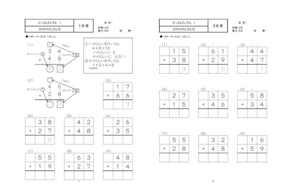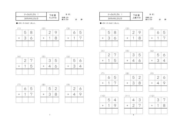 筆算たし算を8週で完結!スコーラで使用していた宿題用と授業用冊子を上下巻にまとめました! 2桁・3桁、8桁のたし算まで挑戦できます。