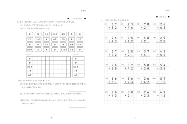 基礎問題と上級文章題。 表とグラフ、時刻と時間、筆算たし算、筆算ひき算、大きな数、長さとかさ、線分図、図形と箱、分数、かけ算、文章題。