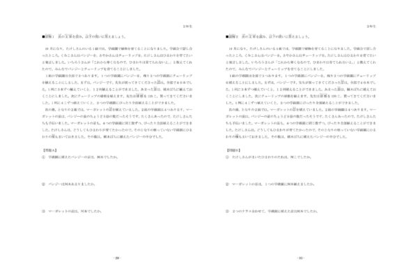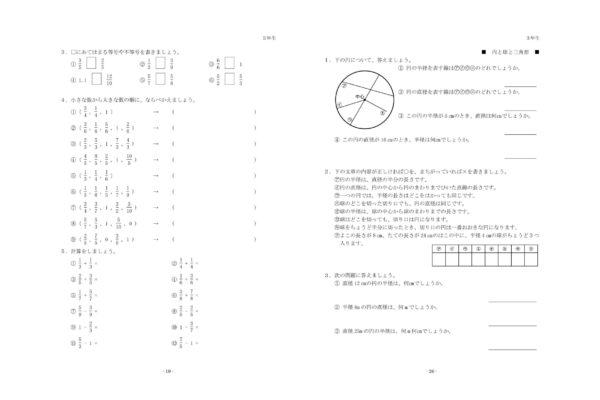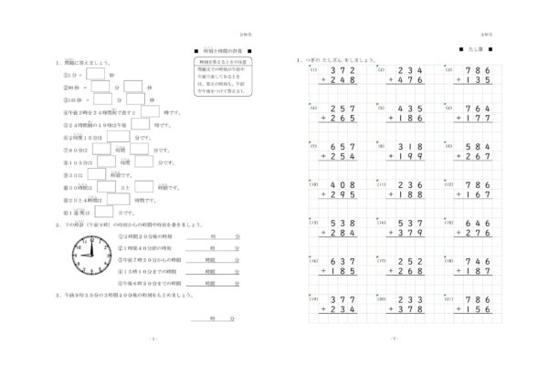 基礎問題と上級文章題。 時刻と時間の計算、わり算、筆算たし算・ひき算・かけ算、大きな数、長さと重さ、分数、小数、□を使った式、表とグラフ、円と球と三角形、上級文章題。